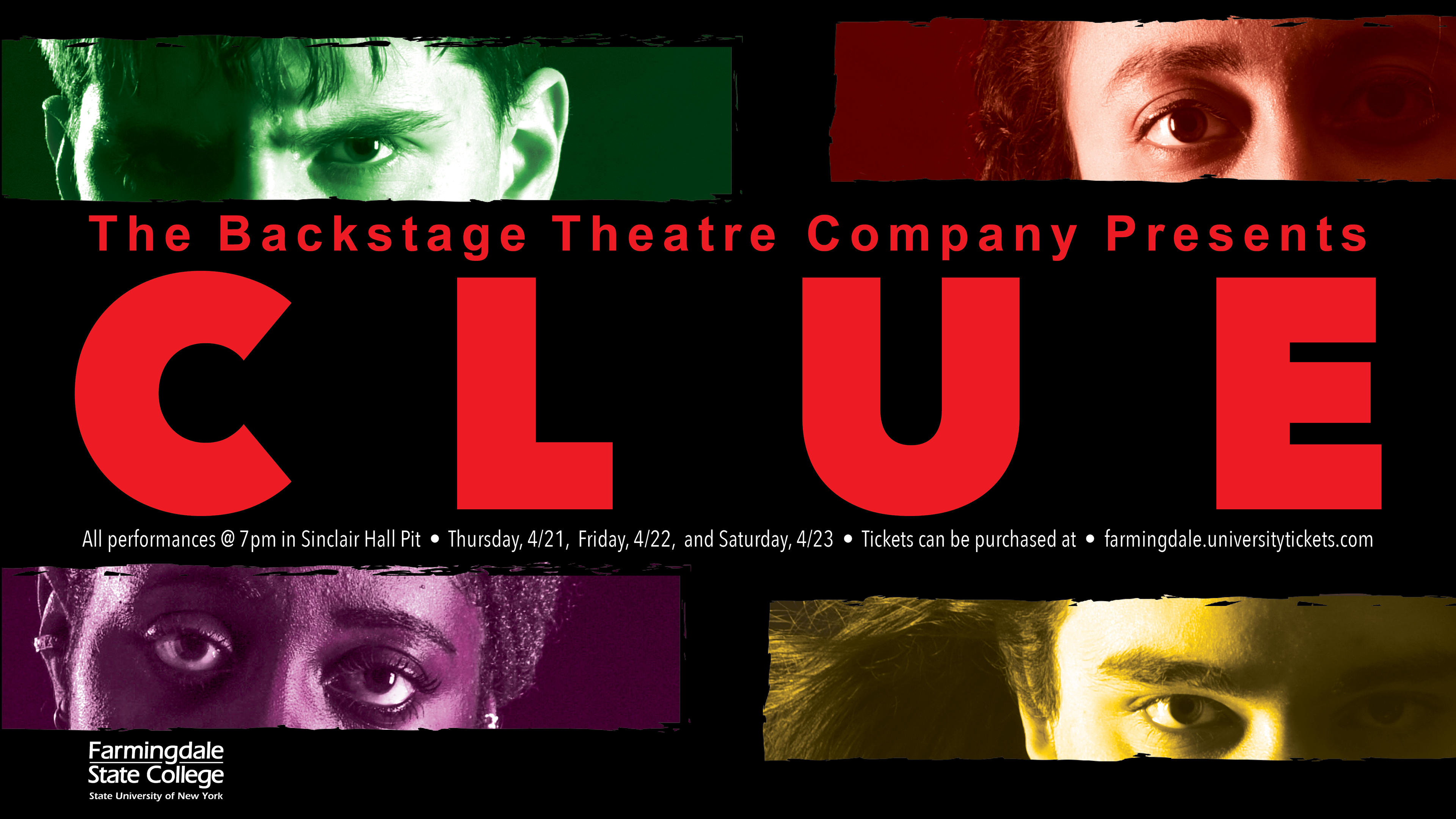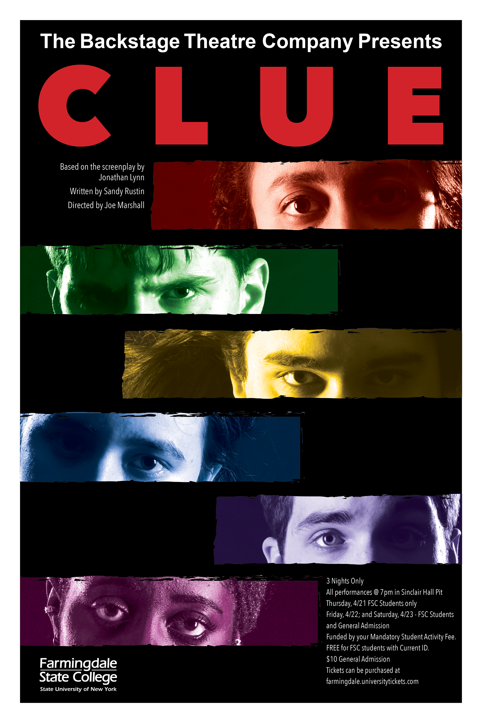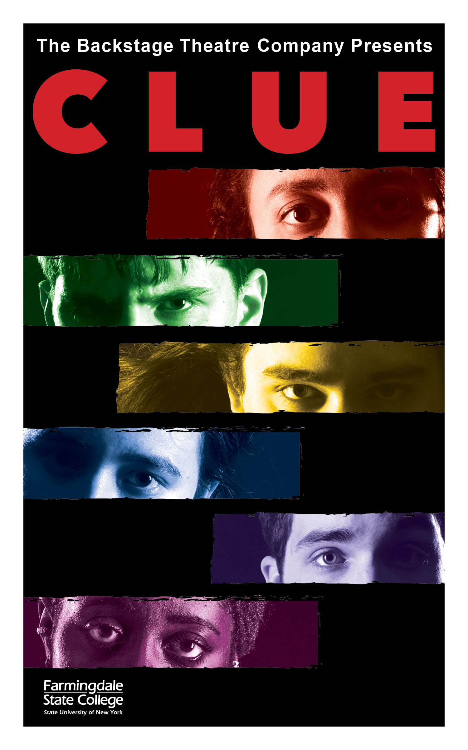 Promotional poster, play bill, and digital banner for Backstage Theatre company's production fo "Clue"